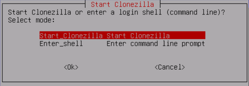 Si ya hemos usado alguna vez Clonezilla o conocemos los comandos, podemos acceder a un terminal (Enter_shell) para poder usarlo de manera más rápido. Si por el contrario elegimos la opción Start_Clonezilla, que nos llevará al siguiente menú: